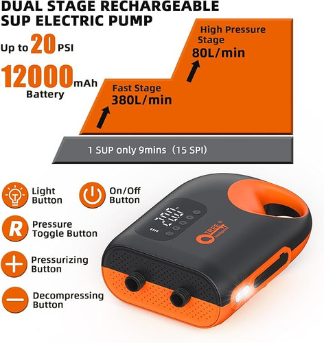 پمپ هوای SUP قابل شارژ 12000 میلی آمپر ساعتی، بادکردن هوشمند دو مرحله ای با فشار بالا 20PSI با ویژگی خاموش شدن خودکار و نور LED، عملکرد باد کردن برای تخته های پارویی ایستاده، قایق ها، چادرناموجود