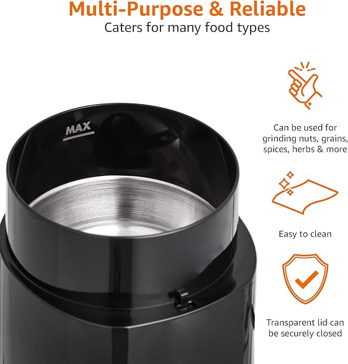 آسیاب قهوه برقی Amazon Basics با طراحی جمعوجور و عملکرد قدرتمند، انتخابی ایدهآل برای عاشقان قهوه است. این دستگاه با تیغههای استیل ضدزنگ، دانههای قهوه را در چند ثانیه به پودری یکدست تبدیل میکند و امکان تنظیم درجه آسیاب (از پودر نرم برای قهوه ترک تا درشت برای فرانسه) را فراهم میسازد.