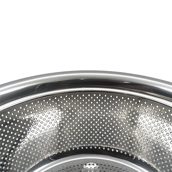 آبکشهای این سرویس به شکل گرد طراحی شدهاند که یکی از رایجترین و کارآمدترین فرمها برای شستوشوی مواد غذایی محسوب میشود. سوراخهای منظم در بدنه و کف آبکشها امکان خروج سریع آب را فراهم میکنند، بدون آنکه مواد داخل ظرف بیرون بریزند. لبهها کاملاً صاف و پرداختشده هستند تا جابهجایی آنها ایمن و راحت باشد. دستههای تعبیهشده روی هر آبکش نیز کار حمل و تخلیه را آسانتر کرده و کنترل بهتری هنگام استفاده میدهد.