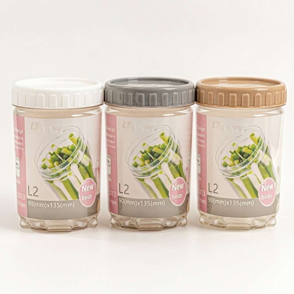 رنگ: بدنه کاملاً شفاف برای دیدن محتویات، درب معمولاً سفید، مشکی، طوسی یا نقرهای