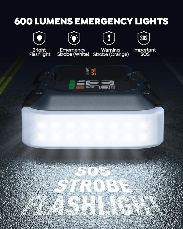 【چراغ اضطراری بزرگ 600 لومن】 بسته باتری جامپ استارتر با چراغ های LED به روز شده 600 لومن، ناحیه نورانی بزرگتر و تابش زاویه باز 300 درجه، به طور قابل توجهی روشنایی 400%+ را ارائه می دهد. چراغهای 4 حالته برای اضطرار مختلف و به عنوان مثلث هشدار دهنده هستند. بهتر از همتایان خود عمل کنید و احساس امنیت را برای شما به ارمغان بیاورد.