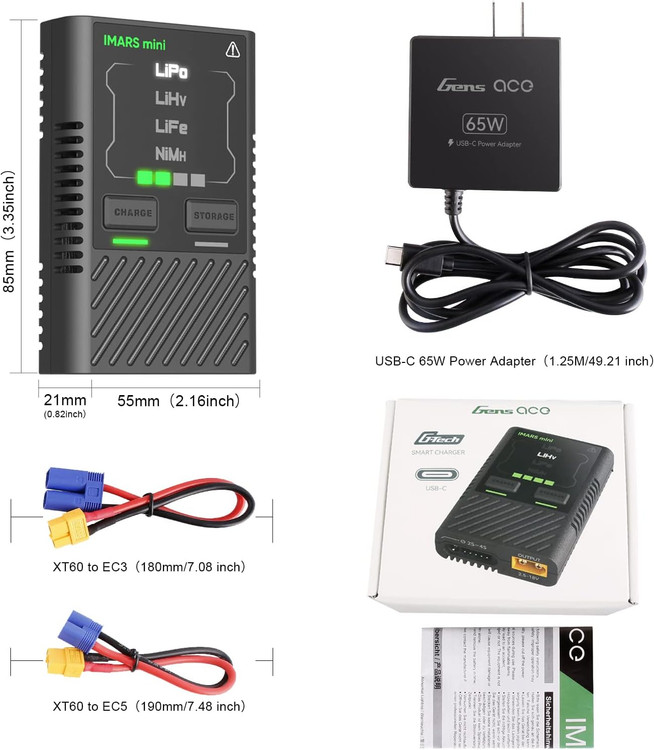 Gens ace Imars Mini G-Tech Series 60W Lipo Battery Charger with a 65W Type-C PD Adapter for LiPo/Life/LiHV 2-4S, NiMH 2-12S