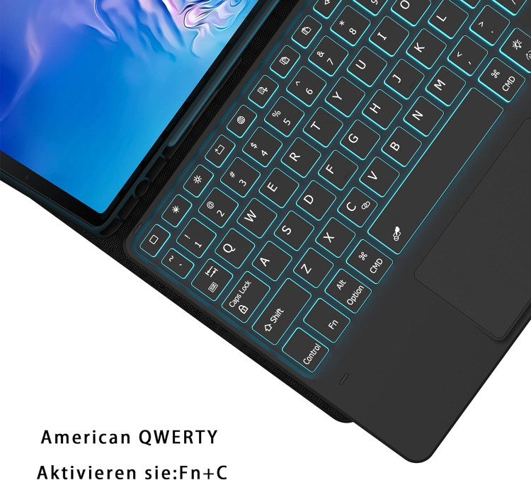 صفحه کلید با نور پس زمینه برای Samsung Tab S9 FE/S9 2023 - جعبه تبلت تب S9 FE با صفحه کلید دارای 3 گزینه نور پس زمینه رنگی منطقه 7 و 3 حالت روشنایی است، دارای 3 تنظیم حالت روشنایی برای راحتی بیشتر. چیدمان جادار صفحه کلید با نور پس زمینه برای تایپ راحت است و سرشار از علم و فناوری است. می توانید در هر زمان و هر مکان آزادانه بخوانید، مرور کنید و کار کنید. زمانی که تا دیر وقت کار می کنید، به سادگی به یکی از ۷ رنگ نور پس زمینه تغییر دهید تا صفحه کلید را روشن کنید و از ۵ ساعت عمر باتری لذت ببرید.