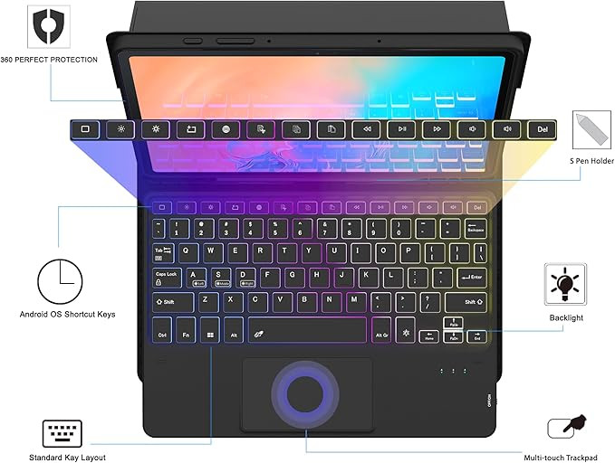 صفحهکلید لپتاپ مانند ترکپد چند لمسی - این قاب صفحهکلید برای Galaxy Tab S9 11"/S9 FE 10.9" دارای یک پد لمسی یکپارچه است که کاملاً با سیستم سازگار است، با حرکات ترکپد مختلف، تجربه استفاده راحت را هنگام کلیک کردن، پیمایش ارائه میکند. و بدون زحمت در محتوا تند تند بکشید. به شما این امکان را میدهد که تب S9 fe 10.9 اینچی سامسونگ خود را به یک لپتاپ واقعی تبدیل کنید و برای تایپ کردن، تماشا کردن، کار کردن و حمل بدون نیاز به ماوس بسیار راحت است.