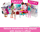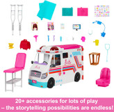 کلینیک مراقبت از باربی، هم آمبولانس و هم بیمارستان، سرگرمی دو در یک را با دگرگونی آسان ارائه می دهد. به عنوان آمبولانس به تماسها پاسخ دهید - آژیر به صدا در میآید و چراغها با فشار دادن یک دکمه روشن میشوند - سپس وقتی رسیدید، مراقبتها را انجام دهید. به سادگی اهرم پشت خودرو را بلند کنید تا فوراً به کلینیک مراقبتی با عرض بیش از 2 فوت تبدیل شود! هر دو طرف باز می شوند تا سه فضای بازی متمایز را نشان دهند: یک منطقه چک-این با میز پذیرایی پاپ آپ و صندلی چرخان، یک اتاق انتظار با یک فروشگاه هدیه غافلگیرکننده که پشت تلویزیون پنهان شده است و یک اتاق امتحان با دستگاه اشعه ایکس که دو برابر می شود. یک نمودار بینایی، بهعلاوه یک تخت امتحان «غلتان» که از تخت به نشسته تنظیم میشود (درست مانند تخت واقعی)! بیش از 20 قطعه اضافی داستان سرایی را تحریک می کند، و الهام بخش بازی تمام روز با داستان های بی پایان است. تجهیزات تشخیصی مانند گوشی پزشکی و کاف فشار خون، لوازم پزشکی مانند گچ و عصا، مجلات اتاق انتظار و اقلام فروشگاه هدیه مانند خرس عروسکی یا بادکنک وجود دارد. این هدیه عالی برای پزشکان مشتاق است. برخی از قطعات حتی دارای دسته هایی هستند که یک عروسک می تواند نگه دارد (عروسک ها به طور جداگانه فروخته می شوند) برای واقع گرایی بیشتر و سرگرمی ایفای نقش. وقتی آخرین بیمار دیده شد، کلینیک را ببندید تا به آمبولانس برگردید و به سراغ بیمار بعدی بروید! با این وسیله نقلیه و مجموعه بازی باربی انواع حرفه های پزشکی از پرستار گرفته تا پزشک را کاوش کنید زیرا وقتی یک دختر با باربی بازی می کند، هر چیزی را که می تواند تبدیل شود تصور می کند! شامل تبدیل وسیله نقلیه / کلینیک مراقبت با بیش از 20 لوازم جانبی.