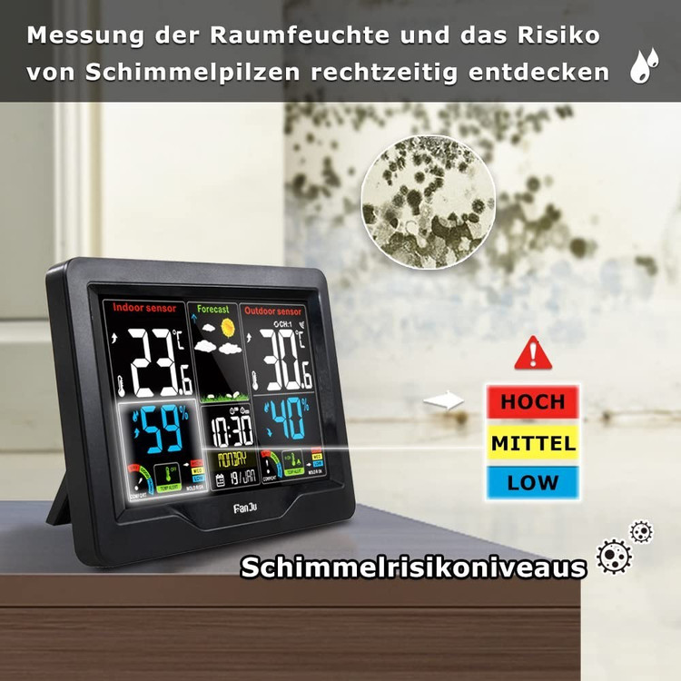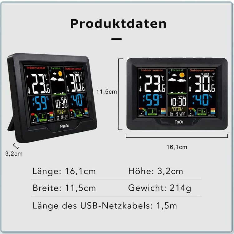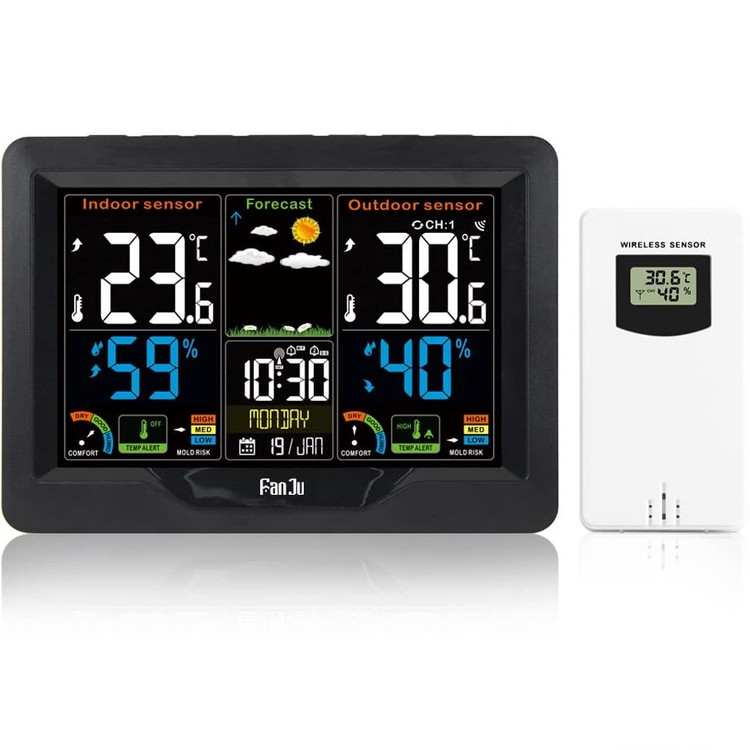 ایستگاه هواشناسی Fanju FJ3383C یک دستگاه چندمنظوره با نمایشگر رنگی است که برای نظارت بر شرایط جوی داخل و خارج منزل طراحی شده است. این محصول با قابلیت پیشبینی آبوهوا، نمایش دما و رطوبت و ساعت اتمی دقیق (با قابلیت دریافت سیگنالهای WWVB/DCF/MSF) گزینهای ایدهآل برای خانهها، دفاتر کار و محیطهای صنعتی است.