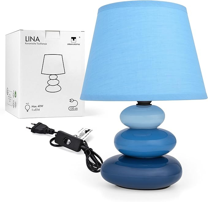 Urban Lifestyle Lina Bedside Lamp (Blue) Table Lamp, Ceramic Sofa with Fabric Lampshade, Compatible with LED, E14, 230V, [Energy Class A+++]