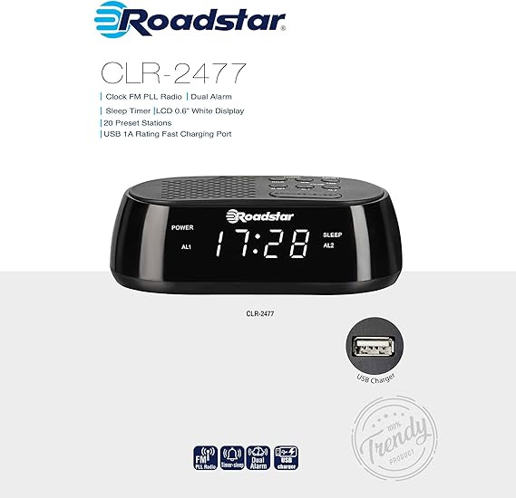 ساعت رادیویی Roadstar CLR-2477 ترکیبی از عملکردهای هوشمند و طراحی مدرن است که نیازهای شما را در یک دستگاه جمعآوری کرده است. این ساعت نه تنها زمان را به شما نشان میدهد، بلکه به عنوان یک رادیو، دستگاه هشدار و حتی شارژر USB نیز عمل میکند.