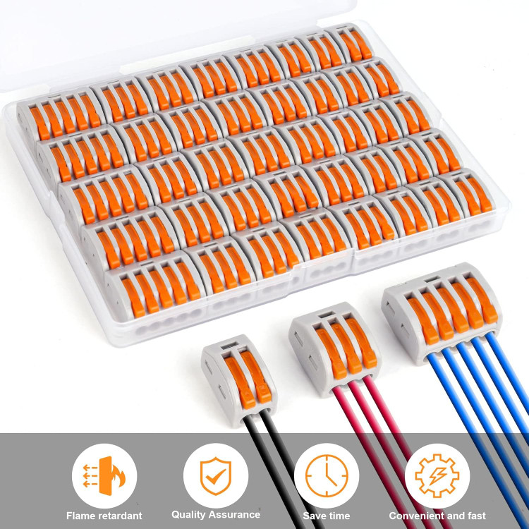 اتصالات Lever-Nut با طراحی فشرده و استفاده از مواد با کیفیت مانند PA/PC مقاوم در برابر آتش ساخته شده است که تضمین میکند در برابر حرارت و خطرات ناشی از آتشسوزی مقاوم باشند. این اتصالات به راحتی قابل استفاده هستند و هیچ نیازی به پیچگوشتی یا ابزار خاصی برای نصب ندارند. فقط کافی است که سیمها را در پورتهای مخصوص قرار داده و اهرم اتصال را فشار دهید تا اتصال محکم و ایمنی برقرار شود.